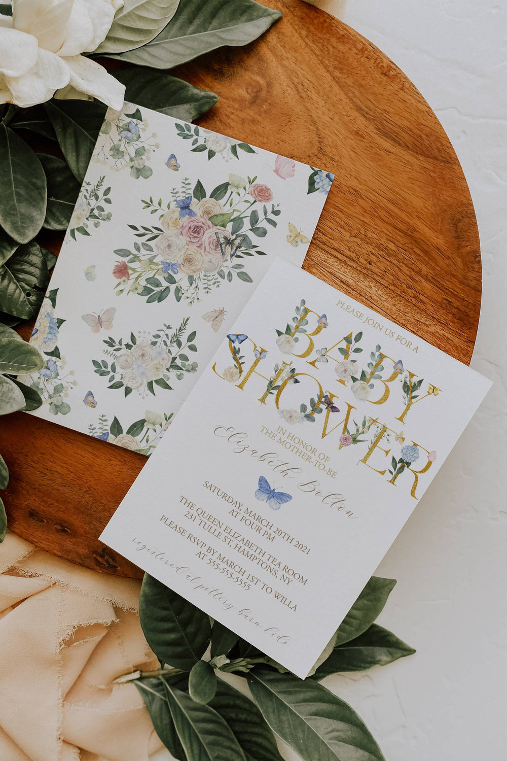 Butterfly Garden Baby Shower - Spring Floral Baby Shower - Butterfly Floral Baby Shower Invitation - Gold Leaf Floral Baby Shower Invite