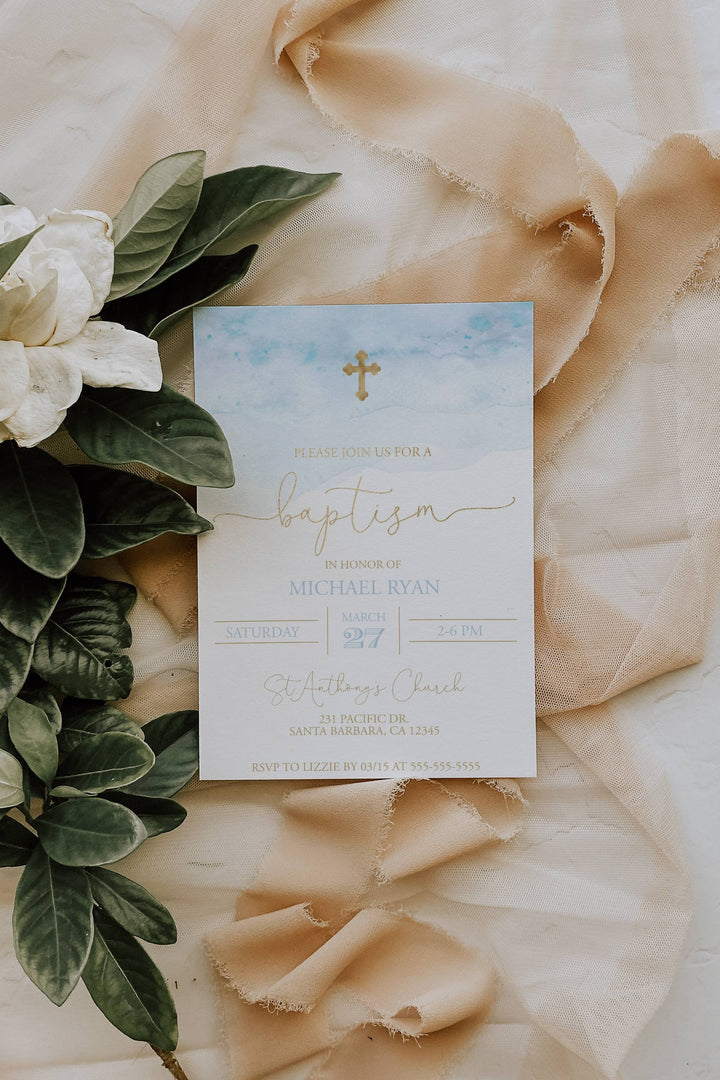 Blue and Gold Baptism Invitation - Watercolor Baptism Invitation - Blue Baptism Invitation - Boys Baptism Invitation - 100% Editable Template