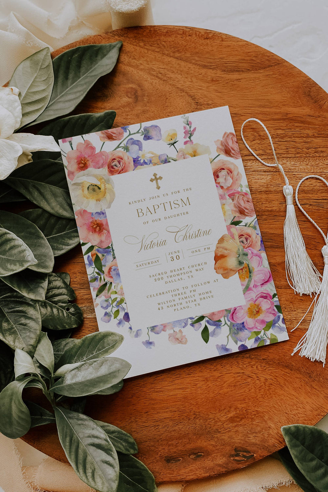 Floral Baptism Invitation - Floral Gold Christening Invitation - Elegant Baptism Invite - Catholic Confirmation Invitation -Christian Invite