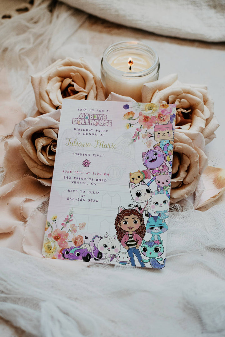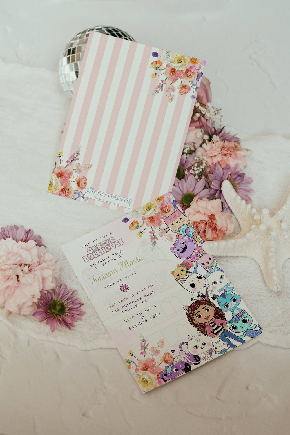 Gabby's Dollhouse Birthday Invitation - Floral Gabby's Dollhouse Invitation - Editable Gabby's Dollhouse Invite - Dollhouse Cat Invitation