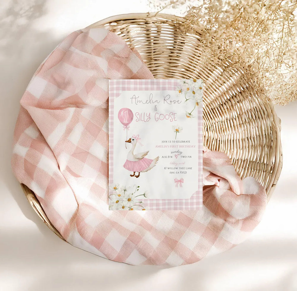 Silly Goose Invitation - One Silly Goose Birthday Invitation - Goose Birthday Invitation - Pink Gingham Invitation - Daisy Invitation Evite