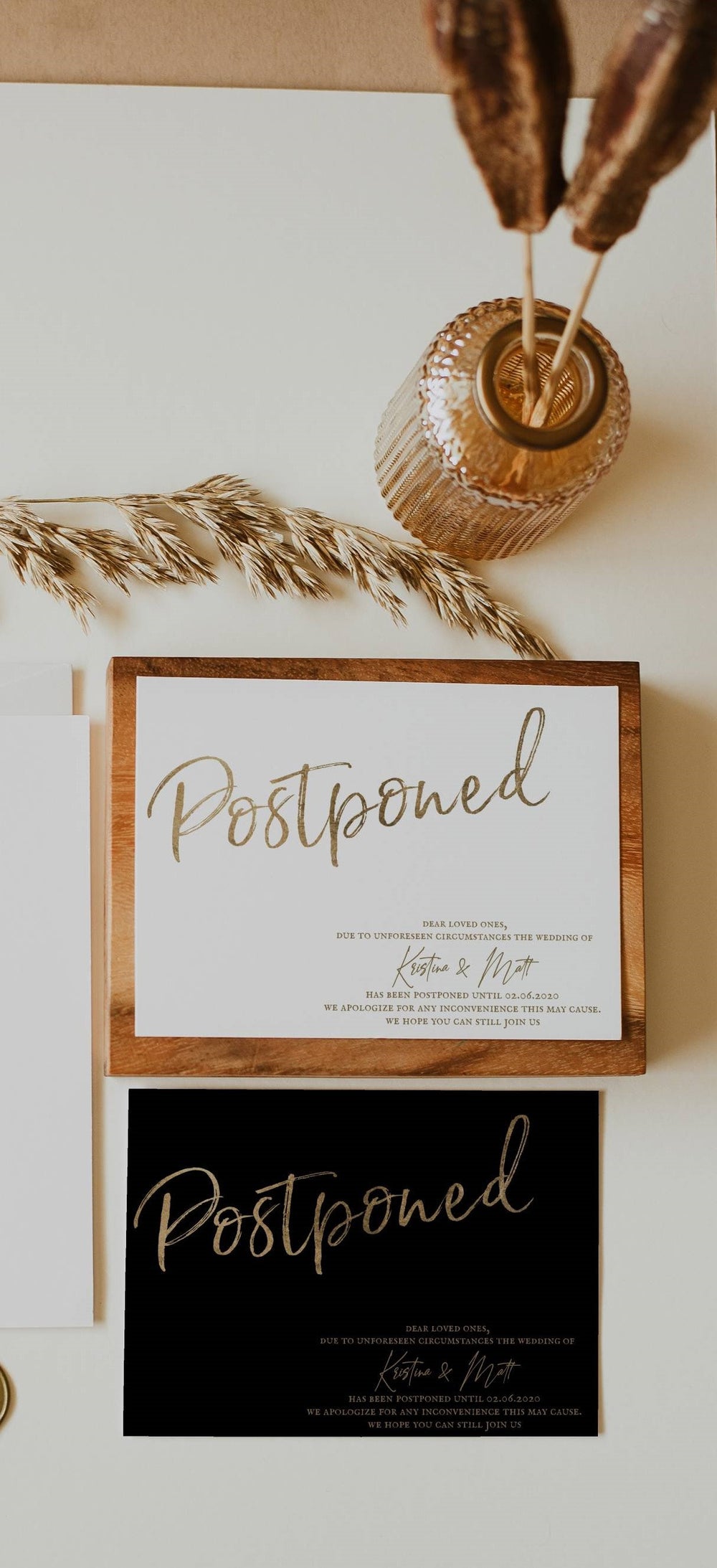 White and Gold Wedding Postponement Announcement - Black and Gold Wedding Postponement Announcement - Postponed Wedding Announcement - 100% Editable Template
